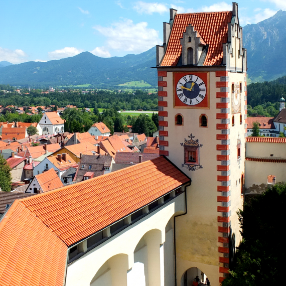 Hoch über der Stadt Füssen liegt eine vollständig erhaltene Burg aus dem Mittelalter. Hier könnt ihr auf den Wehrgang und die Türme steigen und weit über das Land schauen. Mit Suchspiel!